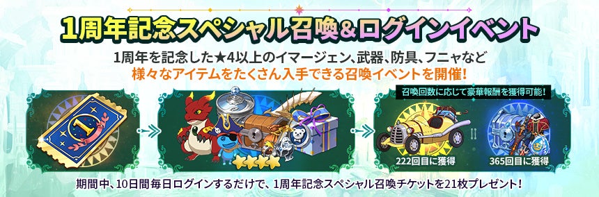 イベント期間中に10日間以上ゲームへログインすることで、合計210枚の「1周年記念スペシャル召喚チケット」がもらえます。入手したチケットは、★4以上の装備、イマージェン、フニャなどを獲得できるイベント召喚「1周年記念!スペシャル召喚」に使用することができます。
