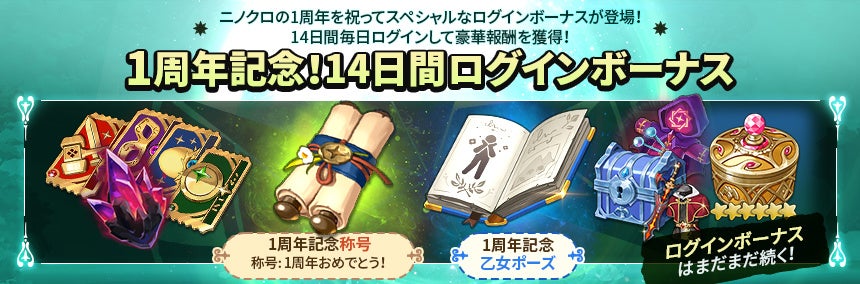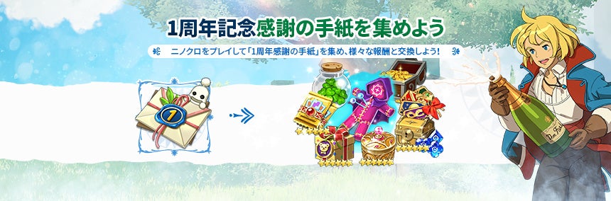 『二ノ国:Cross Worlds』は、明日6月10日(金)に正式リリースから1周年を迎えます。日頃からご愛顧いただいているプレイヤーの皆様と、いつも『ニノクロ』を応援してくださるファンの皆様への感謝を込めて、本日6月9日(木)より、豪華報酬が受け取れるイベント「1周年感謝祭」を開催いたします。
