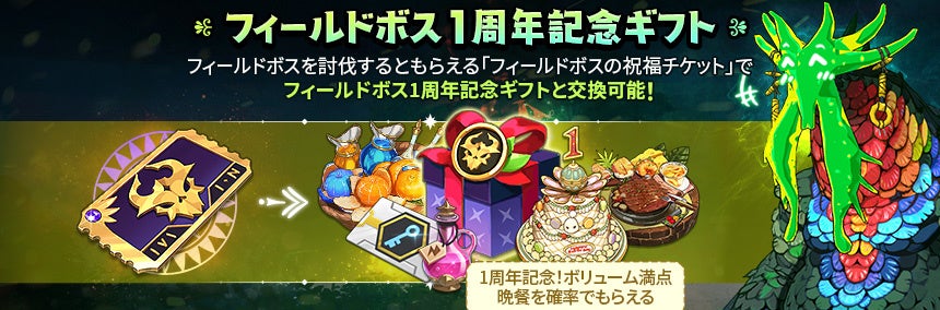 イベント期間中は、フィールドボスを討伐することで「フィールドボスの祝福チケット」を獲得できます。獲得したチケットは、スイートドリンクや晩餐コース料理など様々なアイテムを獲得できる「フィールドボス1周年記念ギフト」と交換することができます。