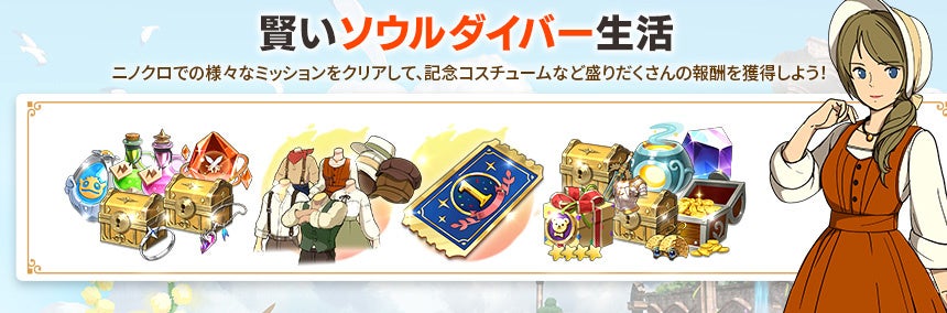 イベント期間中ミッションをクリアすることで、「1周年記念スペシャル召喚チケット」や「★4イマージェンカプセル」などの貴重なアイテムに加え、本アップデートから登場する新コスチュームの「モダンスタイル衣装選択ボックス」や「モダンスタイル帽子選択ボックス」など、様々な報酬を獲得できます。