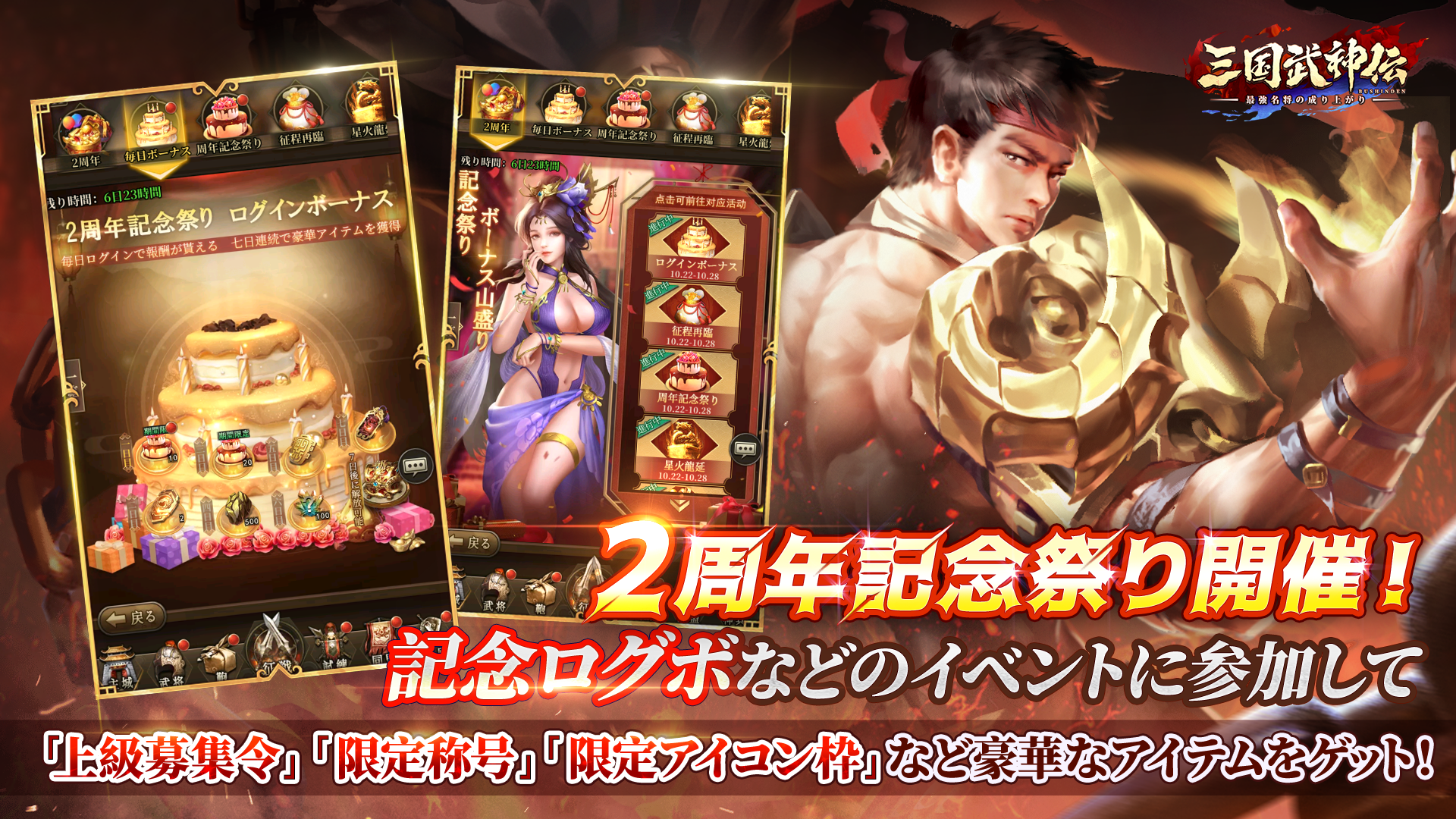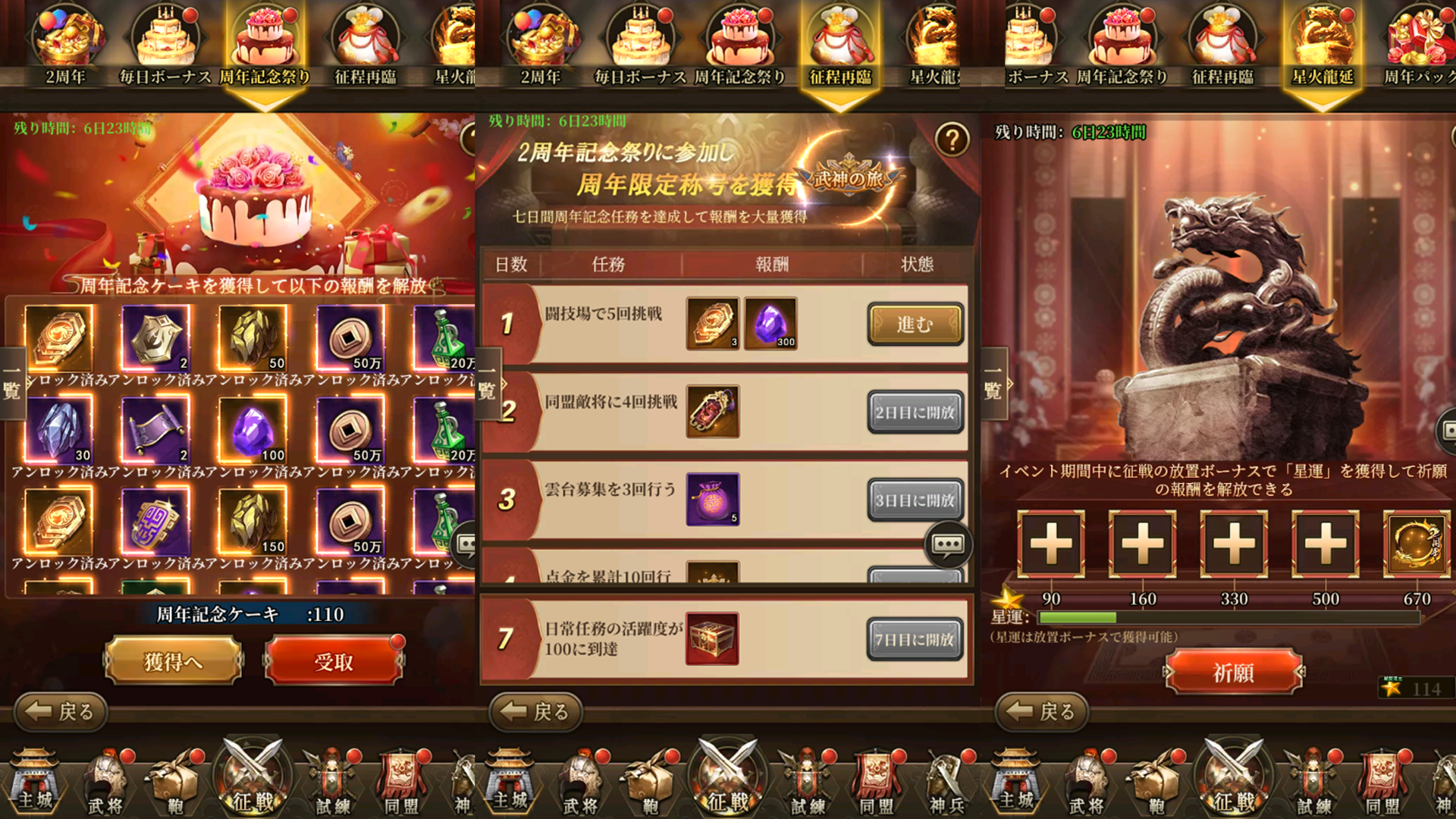 2周年記念イベントには、毎日ログインして「上級募集令」「求賢令」「周年記念ケーキ」などの貴重なアイテムをゲット可能、七日連続ログインすれば豪華アイテムも獲得でき!
