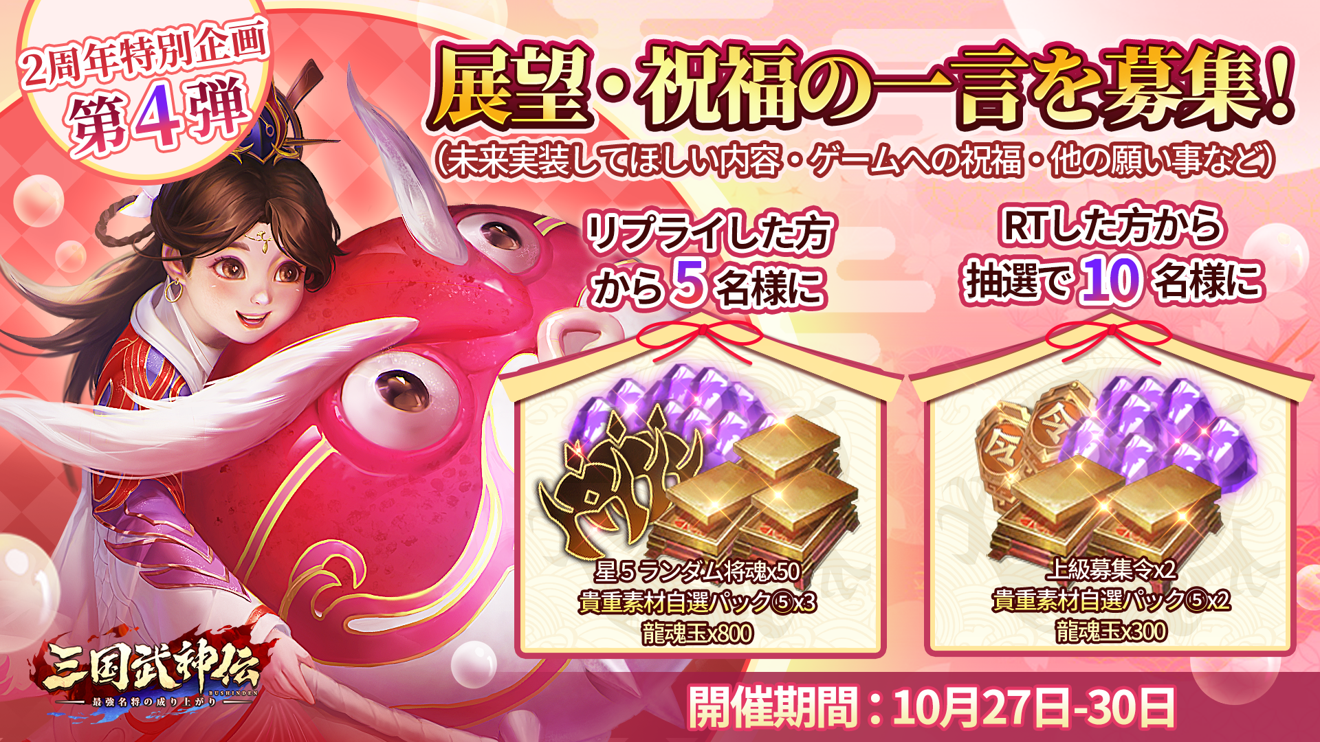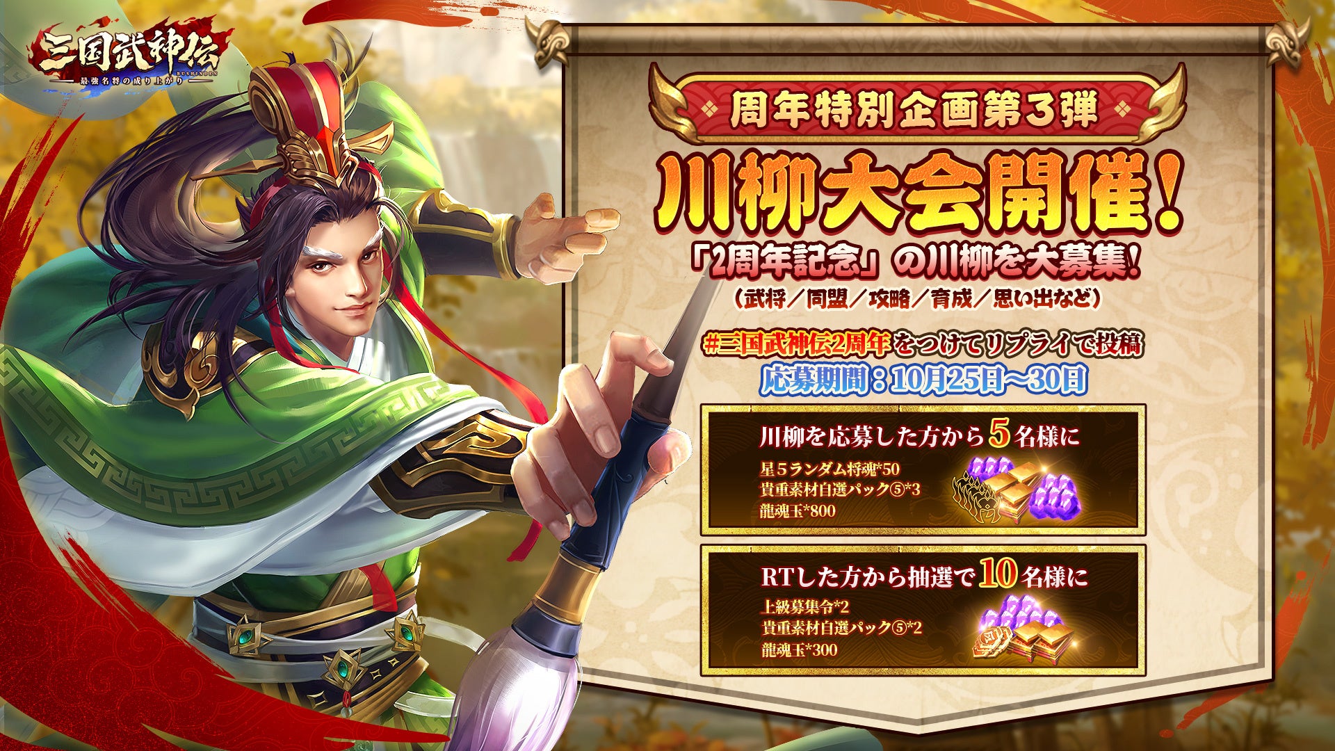 「三国武神伝」2周年を記念し、「2周年記念」の川柳と「周年展望・祝福」の一言募集キャンペーンも公式Twitterで開催する予定です。「いいね」数TOP5の投稿者には「星5ランダム将魂」などの豪華なプレゼントを贈呈します。また、リツイートした方からも抽選で豊富なアイテムをプレゼントします。是非ご参加してください!