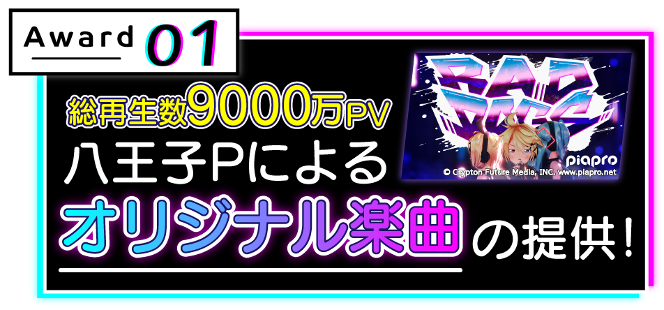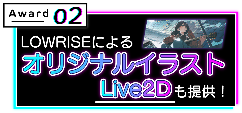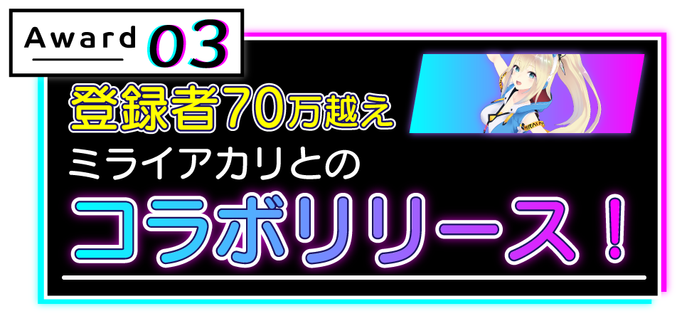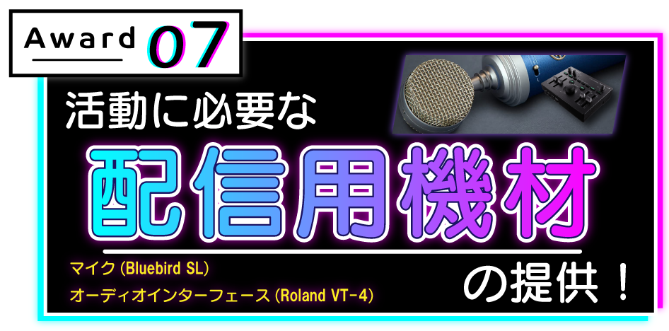 今回のオーディションの合格者には、有名イラストレーターLOWRISEによる合格者の希望に沿ったキャラクターデザインと機材を提供。また、動画再生回数2,000万回を超える「気まぐれメルシィ」や「Gimme×Gimme」を作曲した八王子Pによるオリジナル楽曲制作、超人気バーチャルYouTuber「ミライアカリ」とのコンピレーションアルバムコラボリリースなどVSingerとして華々しくデビューしていただけます。