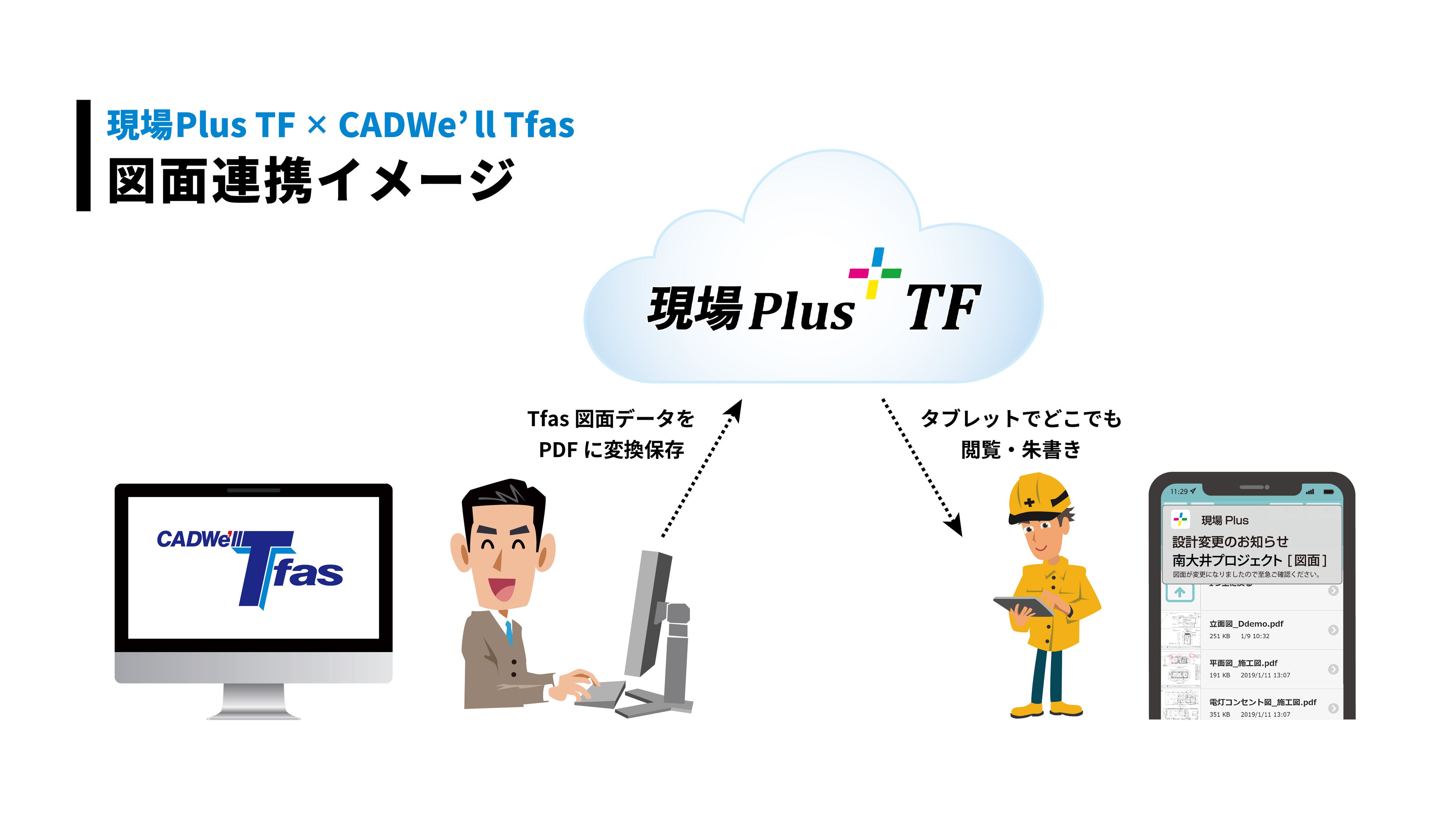 さらに、建築設備専用CADで高いシェアを誇る「CADWe’ll Tfas」(※)と連携し、Tfas図面データをPDFに直接、変換・アップロードする機能にも対応しました。これにより常に最新の図面データを関係者間で共有することが可能となり、PDFをタブレットで確認または朱書機能などを活用することで更に作業効率を高めます。