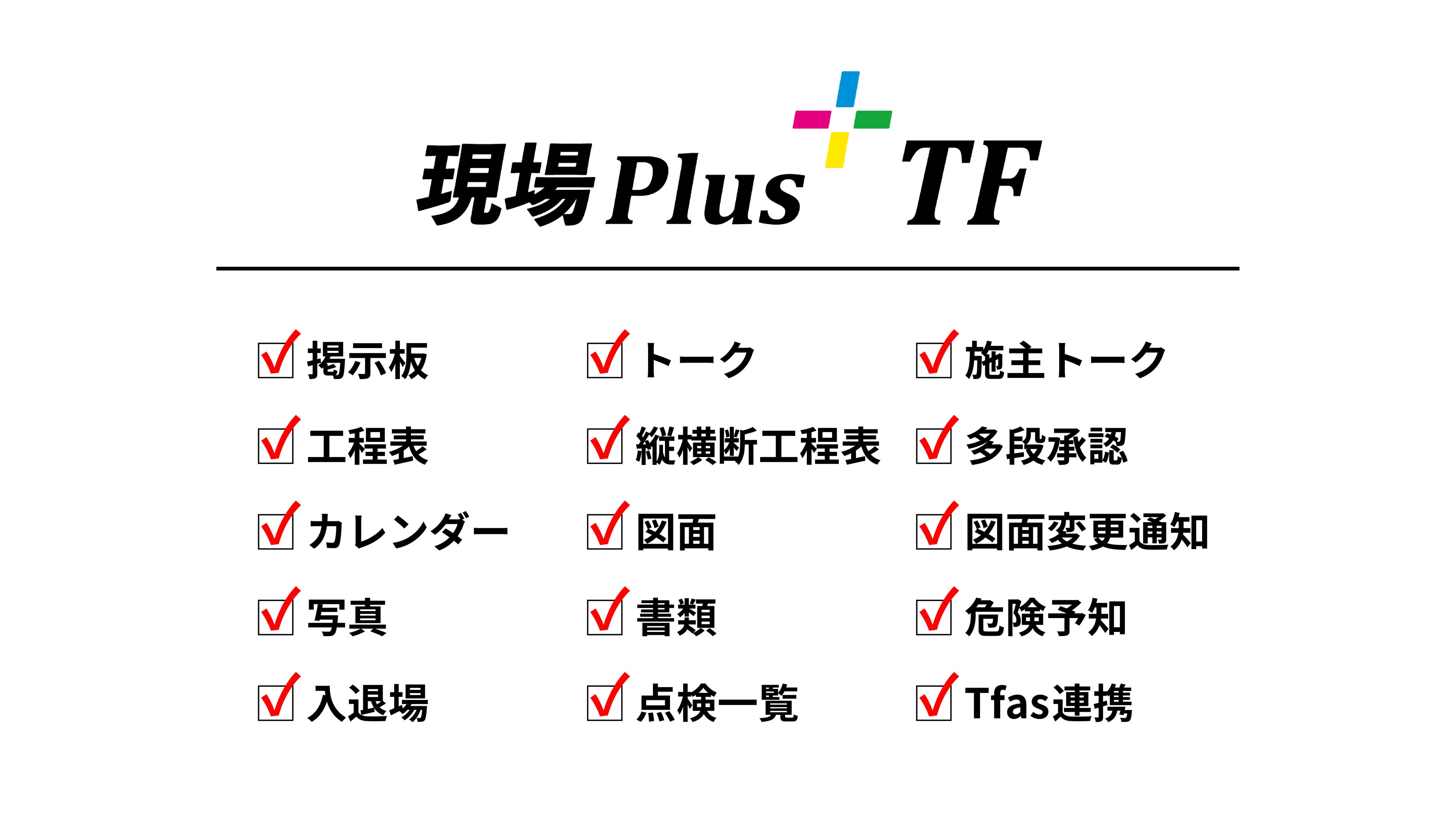 「現場Plus TF」は、主に住宅会社向けに2020年から販売を開始し既に3万社を超えるユーザーに支持されている「現場Plus」を建設業向けに特化させたクラウドサービスです。建設現場の図面・写真・書類など多種多様なデータを自社運用するIDC(インターネット・データセンター)で一元管理することによりクラウド上での共有を可能にし、セキュリティを確保した上で業務の迅速化と円滑化を実現します。