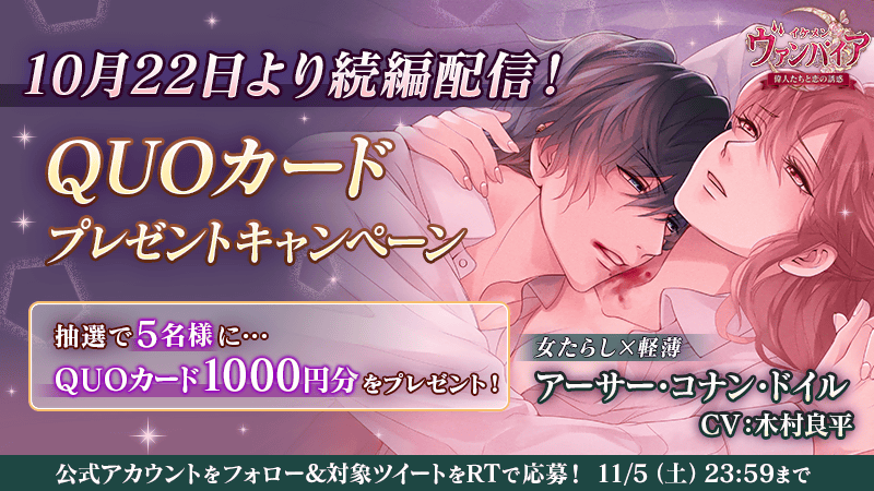 「アーサー・コナン・ドイル」の続編配信を記念して、公式Twitter(https://twitter.com/ikemenvampire)をフォローのうえ該当のツイートをRTいただくと、吸血シーンスチルのQUOカード(1,000円分)が抽選で【5名様】に当たるキャンペーンを実施しています。