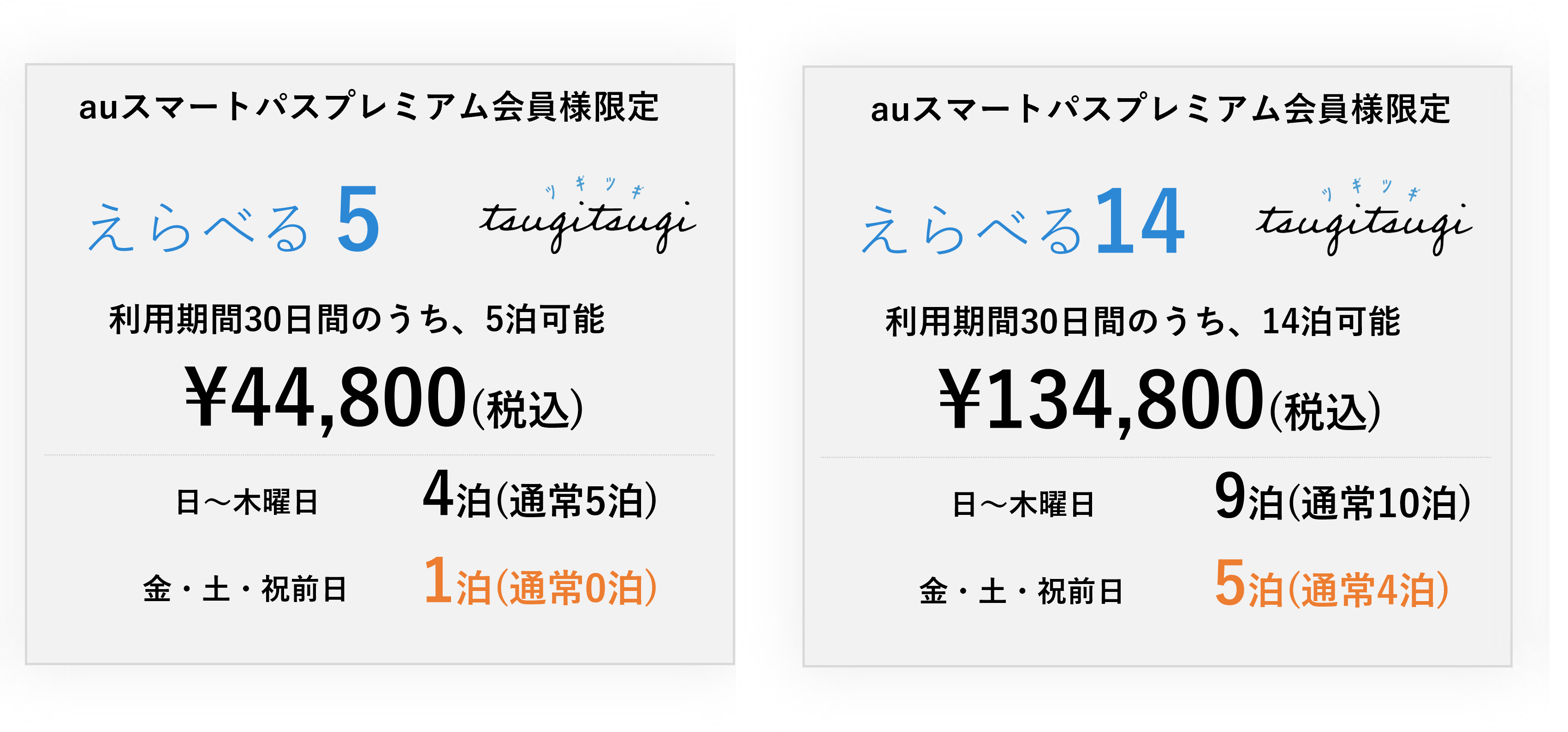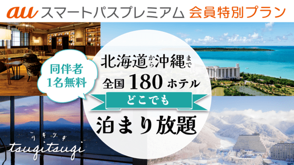 今回auスマートパスプレミアムでは、“30日間で日曜日から木曜日5泊”を選択できる『えらべる5』プランを、“30日間で日曜から木曜4泊プラス休前日1泊”に、また“日曜日から木曜日10泊プラス休前日4泊”を選択できる『えらべる14』 プランを、“30日間で日曜から木曜9泊プラス休前日5泊” に特別グレードアップして提供します。OFFICE PASS付き『えらべる5』、『えらべる14』も特別グレードアップの対象となります。
