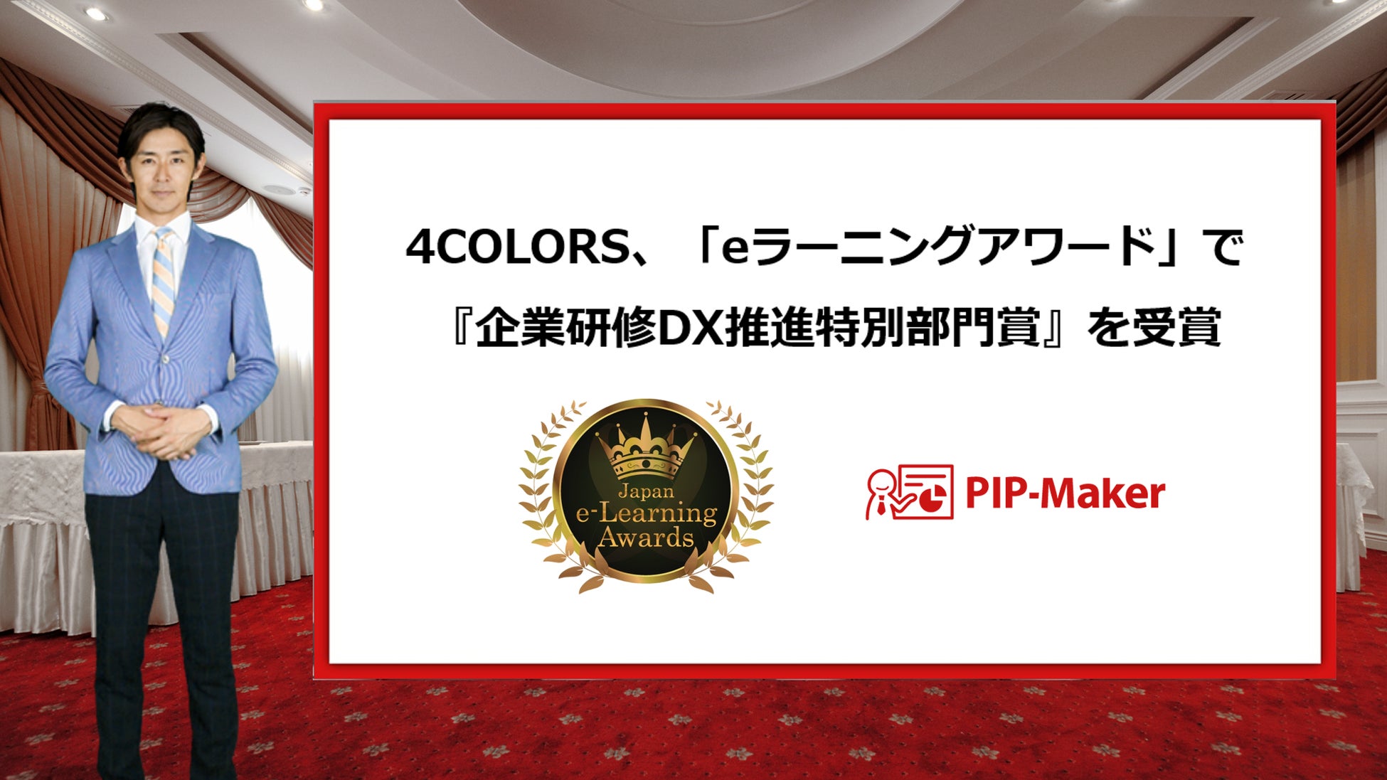 自律的なDXを推進するアバター動画作成サービス『PIP-Maker』(ピーアイピーメーカー)を提供する、株式会社4COLORS(本社:神奈川県横浜市、代表取締役 加山 緑郎、以下4COLORS)は、日本全国、海外からも寄せられた革新的な技術やコンテンツ、eラーニング活用事例を顕彰する「eラーニングアワード」で『企業研修DX推進特別部門賞』を受賞いたしました。