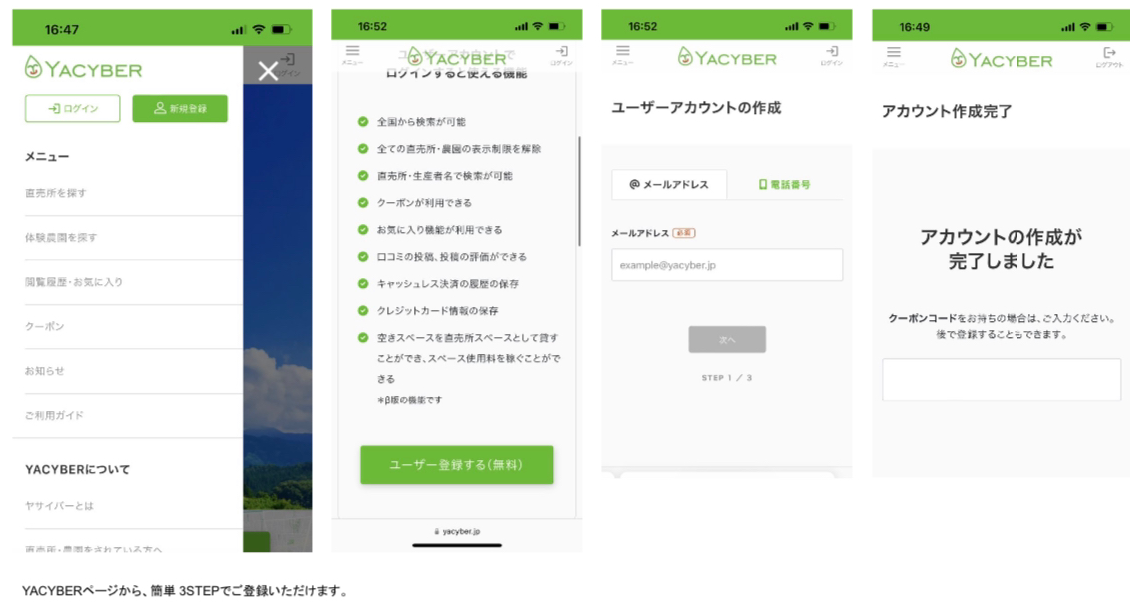 「YACYBER」クーポンを受け取るには「YACYBER」サービスの会員登録(無料)が必要となります。当サービスはスマートフォンアプリ、WEB上での対応が可能となります。