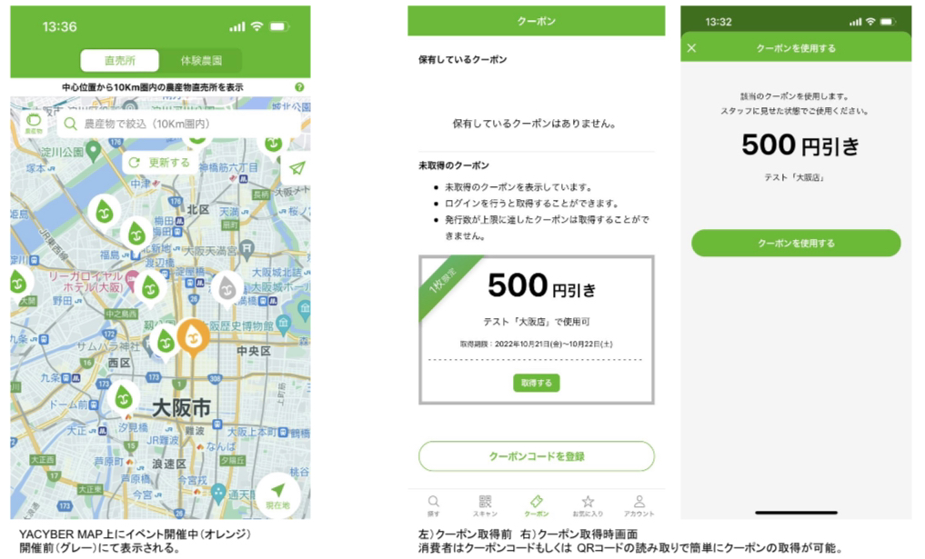 期間中のYACYBER限定クーポンを取得し、新鮮な農産物を直売所で購入することで、お得に農産物の購入が可能なだけでなく、一次産業における課題・食品ロスなどの国際問題へも協力している形となります。