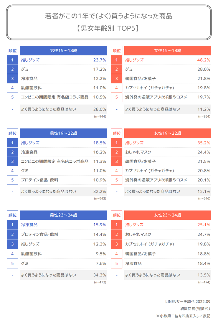 男女年齢別にみてみると、総合1位となった「推しグッズ」が男女共通して上位となりました。女性は15歳~24歳までのすべての年齢層で、男性は15~22歳で1位となりました。その中でも、特に女性15~18歳では5割弱となりました。