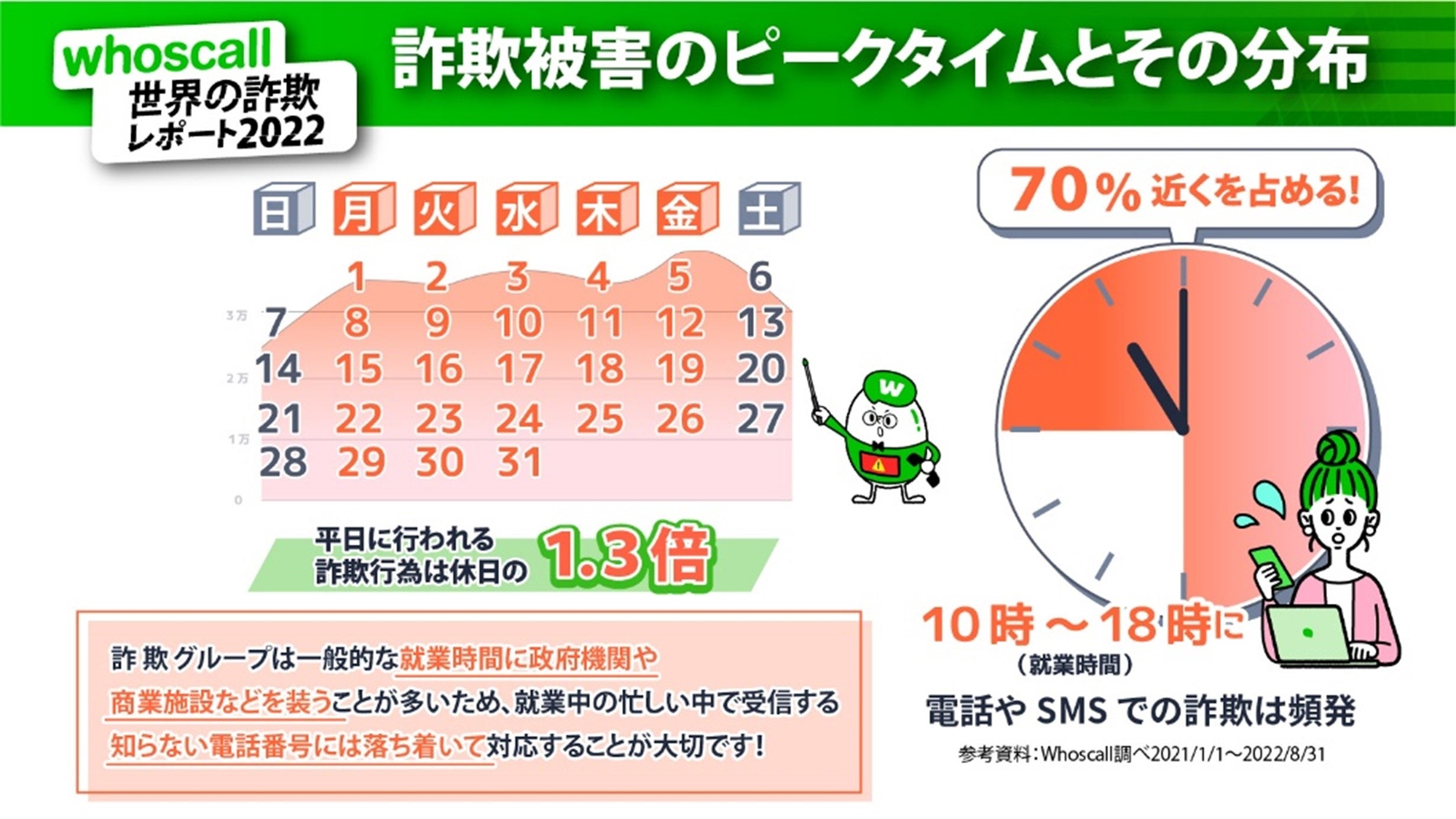 Whoscallの調べによると、詐欺行為が発生する時間は、平日の10時~18時の、最も人が活動している時間帯に多いことがわかりました。詐欺グループは、この時間帯に政府機関や商業施設などを装って詐欺行為を狙ってくるため、就業中の忙しい中に受信する心当たりのないSMSメッセージや、知らない電話番号からの着信には急いで対応をせず、一呼吸おいて判断をしましょう。また、高齢者にとっては、家族が在宅していない時間帯になるため、電話やSMSだけでなく、突然の訪問等への対応方法を家族で事前に取り決めることをお勧めします。