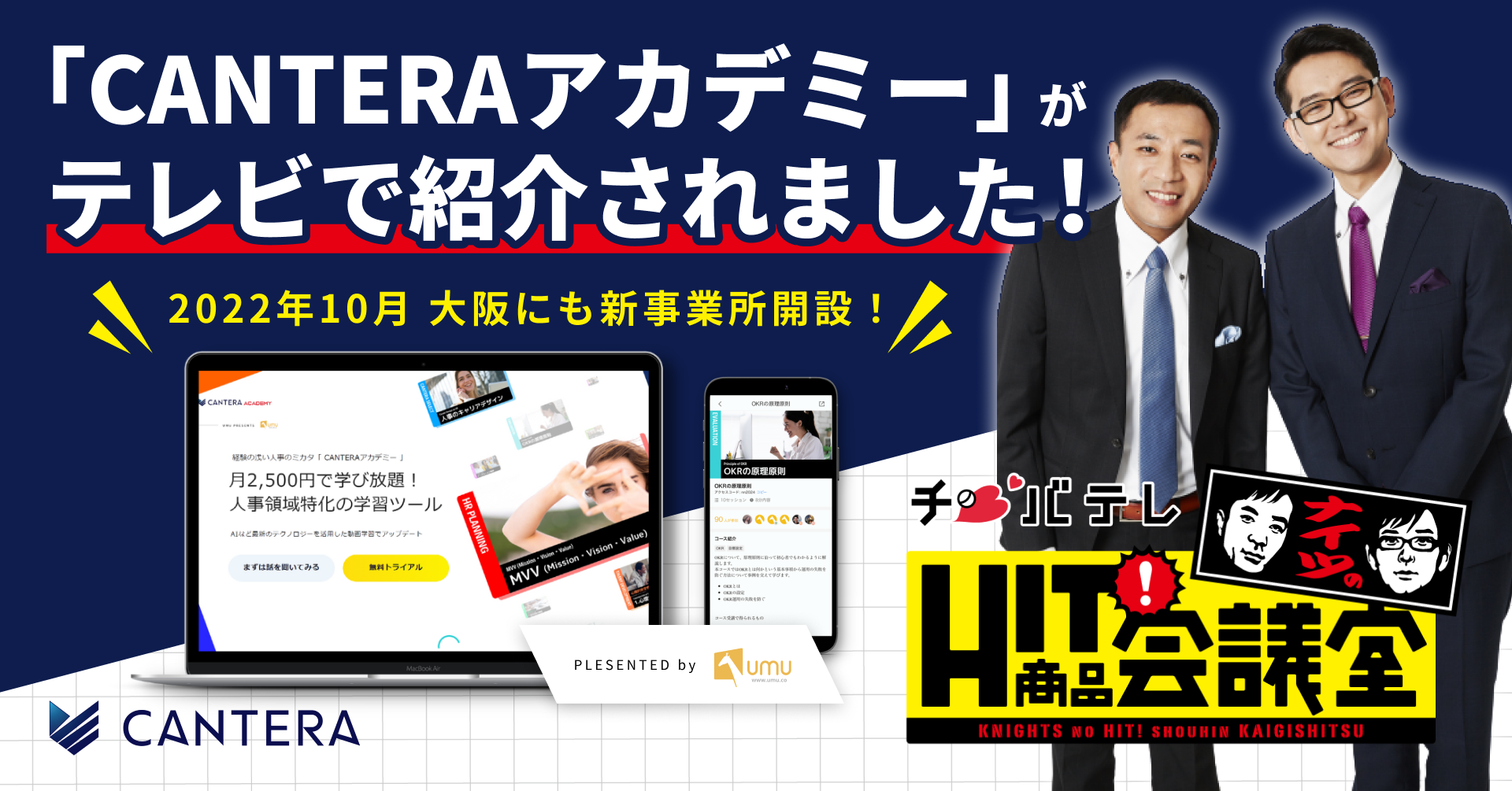 マセキ芸能者所属、お笑い芸人のナイツの二人が企業の商品・サービスなどをHITさせるための会議を行う番組、「ナイツのHIT商品会議室」にて当社サービス「CANTERA(カンテラ)アカデミー(https://account.chro-cantera.jp/)」が特集されました。