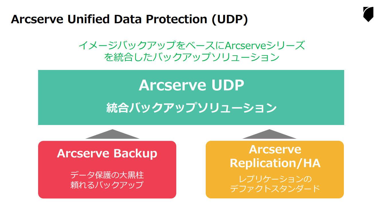 Arcserve UDP は仮想や物理の混在する複雑な環境のニーズを満たす統合バックアップ・リカバリ ソリューションです。イメージバックアップをベースにArcserveシリーズ(Arcserve UDP, Arcserve Backup, Arcserve RHA)を統合したバックアップソリューションです。