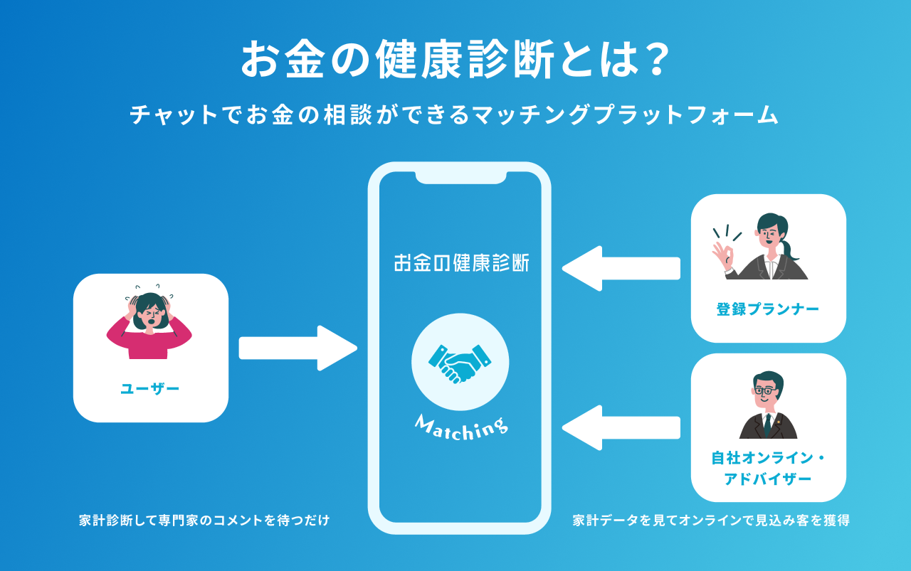 当社は2020年7月に株式会社お金のデザインよりMBOを実施して以降、「お金の悩みを出会いによって解決する」というミッションのもと、お金の相談マッチングプラットフォーム『お金の健康診断』を開発・提供し、資産形成に踏み出すユーザーとお金の専門家であるプランナーのマッチングを通じて、多くの人生を変える出会いを創出してきました。2022年1月からは、『お金の健康診断』を軸とした新規事業として、より多くの人にお金の問題解決の機会を提供することを目的に、投資信託や保険販売の仲介サービスを提供する金融オンライン・アドバイザー事業を展開しています。