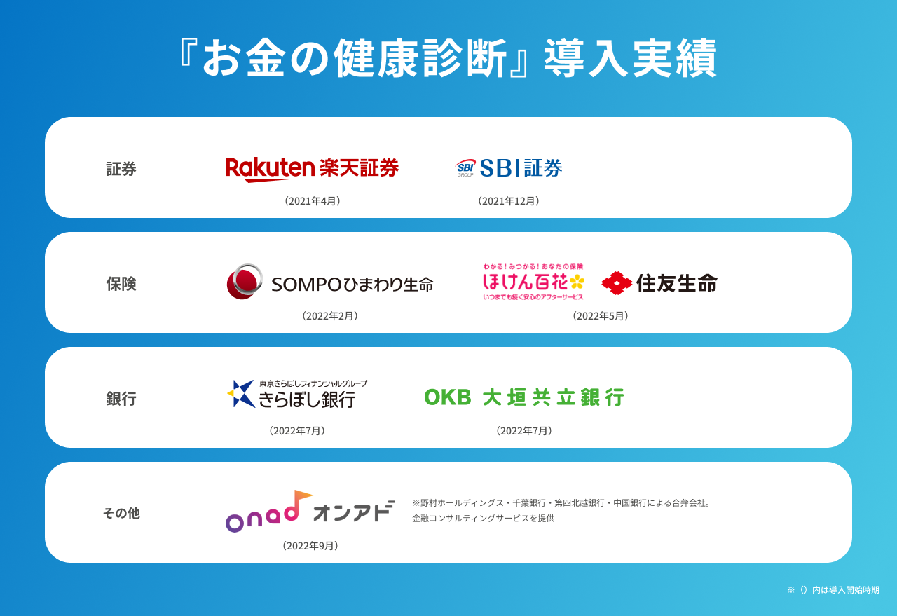 また、『お金の健康診断』は登録プランナーが月額利用料金を支払うと、自ら集客することなく、オンライン上で見込み客の獲得から顧客管理までができる営業ツールです。大手金融機関向けにも「新しい形の顧客創造を実現する画期的なプロダクト」として認知を広げており、銀行・証券・保険分野それぞれの大手金融機関で導入が進んでいます。