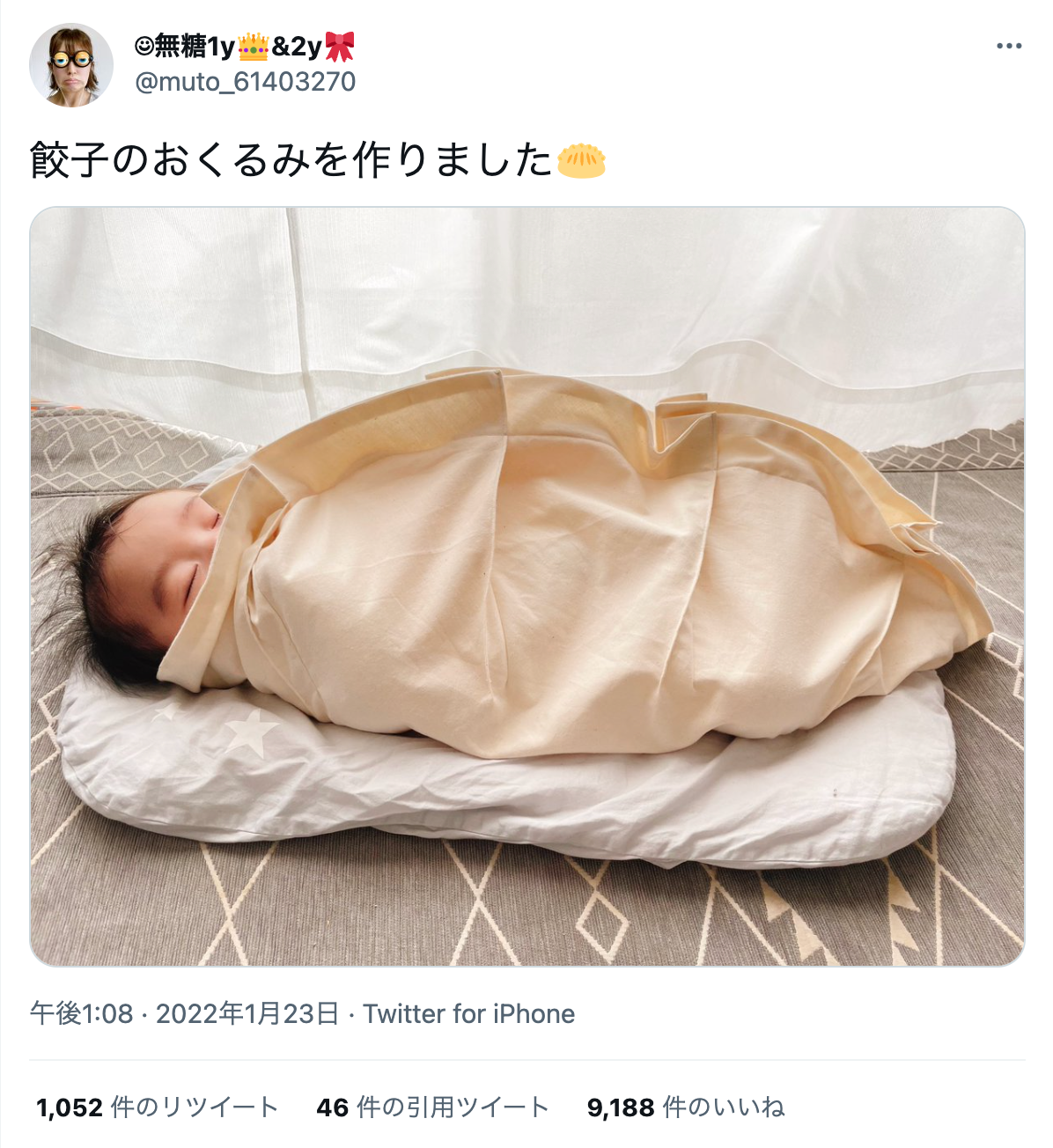 このおくるみは息子が生後4ヶ月の時に思いつきました。むちむちとした赤ちゃんが餃子の皮に包まれたら餡みたいに見えるかな、と我が子の安らかな寝顔を思いながら作った思い入れのあるものです。SNSに投稿した際には多くの方から『カワイイ!』と仰って頂きとても嬉しかったです。