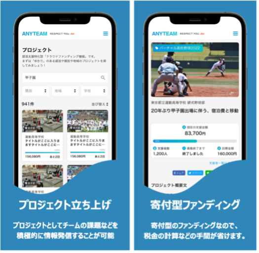 ・「全国大会を勝ち進むにあたって、遠征費が不足している」「練習場の設備を補修したいが、学校の予算が限られていて対応できない」など具体的な課題を抱える部活チームが、ファンに対して直接情報を発信し、支援を募集することができます。