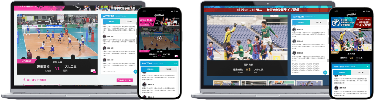 インターネットスポーツメディア「SPORTS BULL」では、全日本バレーボール高等学校選手権大会および全国高校サッカー選手権大会の試合をライブ配信します。ライブ配信の画面に「ANYTEAM」の応援機能を連携させることで、試合の映像を観ながら部活チームに応援メッセージをリアルタイムに送ることができる臨場感のある観戦空間となっています。