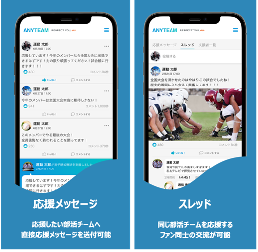 ・応援したい部活チームに対して応援メッセージを送ることができるほか、同じ部活チームを応援するファン同士でコミュニティを作り、スレッドへの書き込みを通じてコミュニケーションができます。