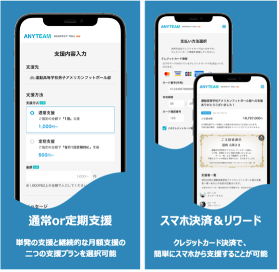 ・クレジットカード決済で簡単に部活チームへのドネーション(寄付)をすることも可能です。部活チーム側からも、具体的な課題や目標を設定し、ファンである利用者に対してクラウドファンディング形式で支援を募ることができます。・パソコン、スマートフォン、タブレットなどさまざまなデバイスからご利用いただけます。