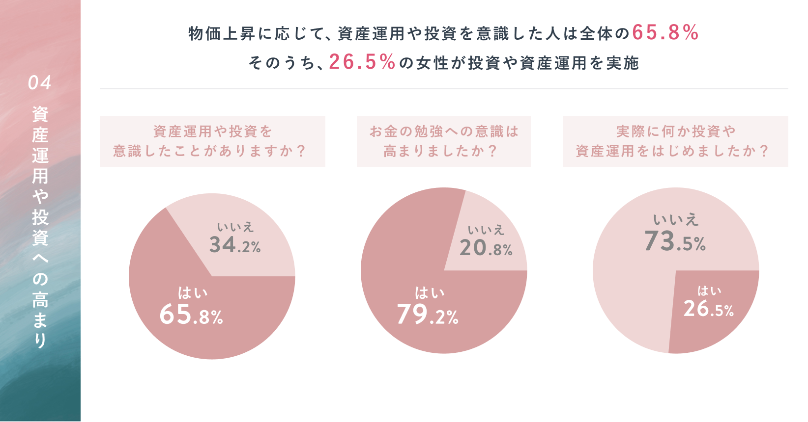 - お金の勉強への意識が高まった女性は79.2%いるが、実際に投資や資産運用を行っている女性は4人に1人