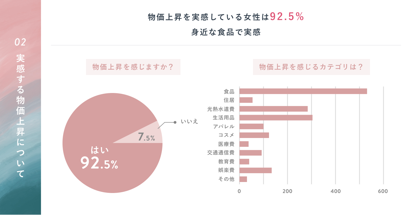 - 物価上昇を感じる92.5%の女性が、物価上昇を感じるカテゴリのベスト3 <第1位 食品(95.5%)、第2位 生活用品(54.6%)、第3位 光熱水道費(51.3%)>