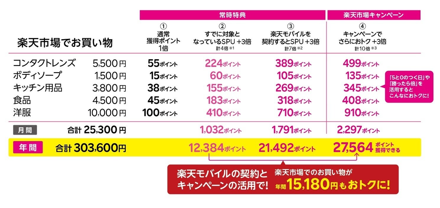 以下の表は、①「楽天市場」でお買い物いただいたお客様で、②すでに「楽天モバイル」以外のサービス利用で「SPU」+3倍を想定した場合、③「楽天モバイル」の契約に加えて、④「楽天市場」のキャンペーンを利用した場合のポイント獲得シミュレーションです(注12)。現状、「SPU」+3倍(通常ポイント1倍を含む計4倍)で「楽天市場」でお買い物をしていただいていますが、「楽天モバイル」のご契約でさらに「SPU」が最大+3倍(計7倍)となり、「5と0のつく日」や「勝ったら倍」などの「楽天市場」のキャンペーンを活用するとさらに最大+3倍(計10倍)となります(注13、14)。「楽天モバイル」契約前と比べて、年間15,180円分もおトクにポイントを獲得できます(注15)。