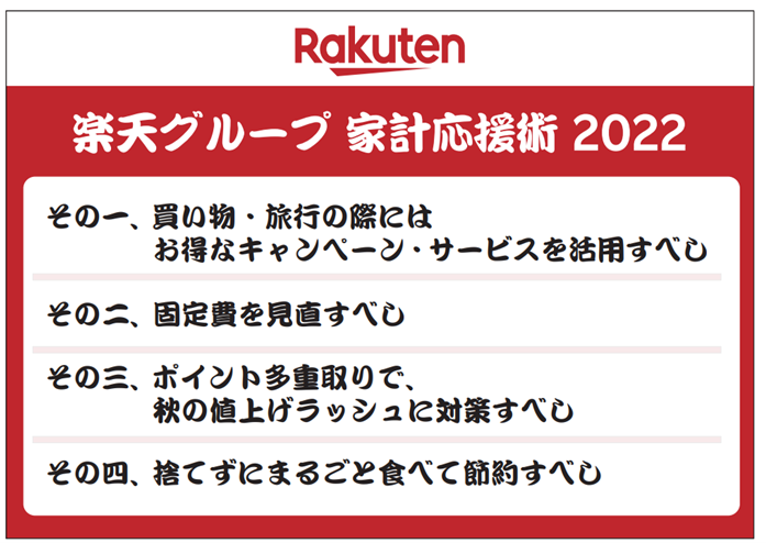 このような背景を受け、楽天のサービスを活用し、おトクに便利に生活を楽しんでいただけるよう、「楽天グループ 家計応援術2022」を紹介します。