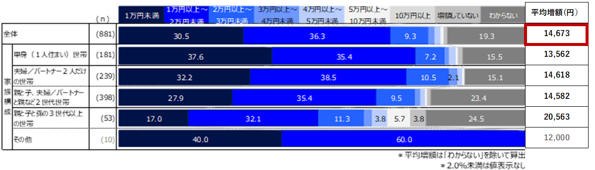 昨今、原材料価格の高騰や急激な円安進行などの社会情勢等を背景に、様々な品目の値上げが続いています。「楽天インサイト」が2022年7月に実施した調査において、モノ・サービスの値上げによる家計への影響を認識している人に対し、1カ月あたりの家計の支出がいくら増額しているかと聞いたところ、平均で14,673円の増額という結果となりました(注3)。