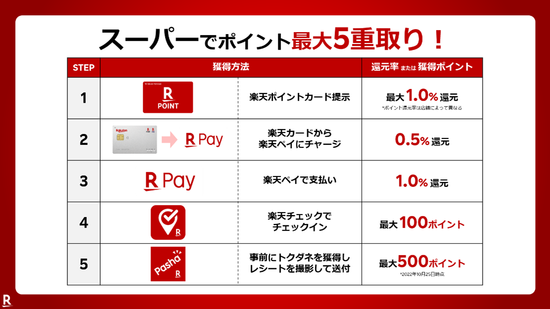 対象のスーパーマーケットやドラッグストアでのお買い物の際に、工夫をすればポイントの多重取りが可能です。例えば、時短節約家のくぅちゃんも、スーパーマーケットでは、「楽天ポイントカード」を提示して、「楽天カード」から「楽天ペイ」にチャージ、「楽天ペイ」で支払いをし、「楽天チェック」でチェックイン、「Rakuten Pasha」でレシートを撮影して送付するとポイントの5重取りができるポイ活を実践しています。