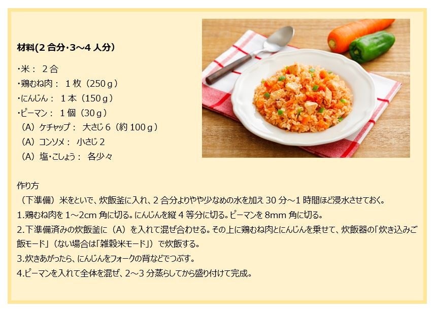「にんじんの皮やピーマンの種などもおいしく食べることができるレシピです。また栄養も豊富で、皮をむく手間も省けて時短・便利です。比較的値段がリーズナブルな鶏むね肉を加えるとさらに満足感もアップします。調理は炊飯器ひとつでできるので、忙しい方も簡単に栄養をとることができます。ご飯に芯が残らず、しっかりと加熱するため米は十分浸水させてください。また、具材が多いため、5合炊き以上の大きさの炊飯器を使用し、炊飯は『炊き込みご飯モード』や『雑穀米モード』などを使用するとふっくら炊くことができておすすめです」
