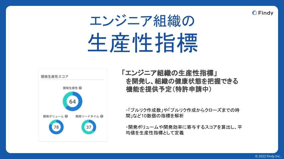 その第一弾として、エンジニア組織の生産性を可視化して組織の”健康状況”を把握できる機能「エンジニアの生産性指標」(特許申請中)を開発しました。「エンジニアの生産性指標」の提供開始は、12月頃を目処に予定しています。また、今後、開発者体験向上に向けた連携ツールの強化や採用サービスとの連携なども行っていきます。