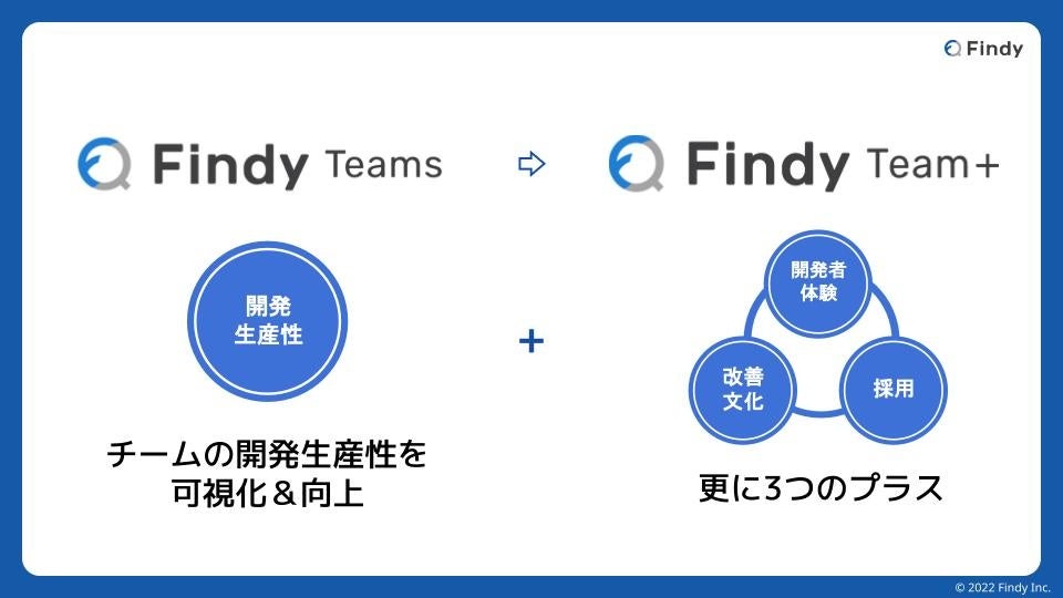 今回の発表会にて、2021年10月より提供しているエンジニア組織支援SaaS「Findy Teams」のサービス名を、10月25日(火)より「Findy Team+」に変更することを発表しました。「Findy Team+」では、従来より提供していたエンジニアチームの生産性可視化・向上に加え、エンジニア組織の「開発者体験」「改善文化」「採用」をサポートするサービスを目指していきます。