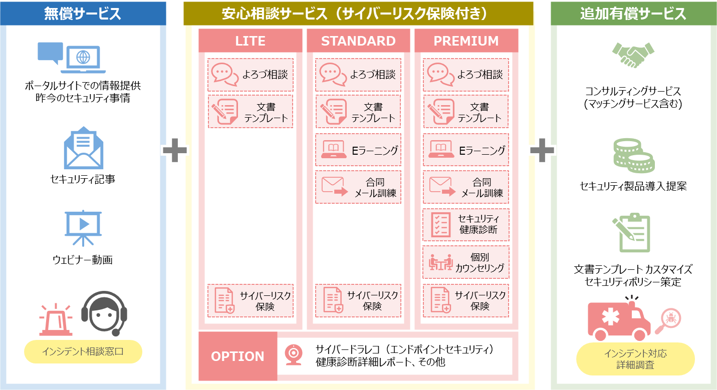 いつでもサイバーセキュリティ専門家にチャットで相談できる窓口、サイバーセキュリティガイドラインテンプレート、従業員教育用eラーニング、メール訓練プログラム、サイバー被害を受けた際の対応費用補償が可能となるサイバーリスク保険などをパッケージ化し、月額15,000円から提供します。