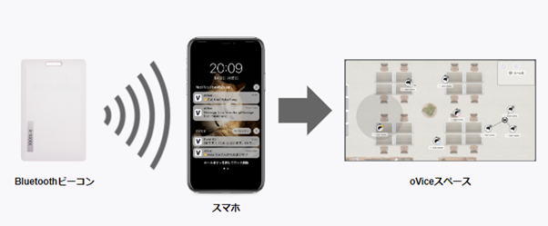 - Bluetoothビーコンをリアルオフィスに設置し、oViceモバイルアプリがどのビーコンの近くにいるかを検知し、スペースと連携してリアルオフィスの位置情報をoVice上に表示させることができます