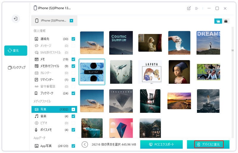 【初期化前】:iCareFoneを起動します。「バックアップを復元」機能を選択して、表示されたデータ項目の中から、必要な項目にチェックをつけて「バックアップ」をクリックします。