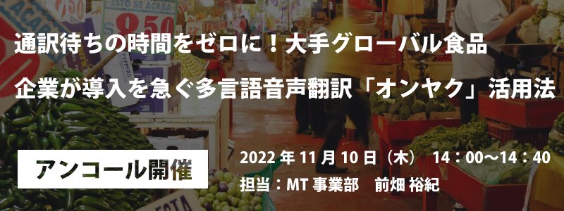そこで本ウェビナーでは、Web会議/商談の発言内容を瞬時に翻訳し、文字起こしする音声翻訳ツール「オンヤク」の実演と活用事例をお届けします。食品大手の企業が頻繁におこなう多言語会議の通訳代わりに使え、また議事録/レポート作成の補助ツールとしても活躍中のツールです。