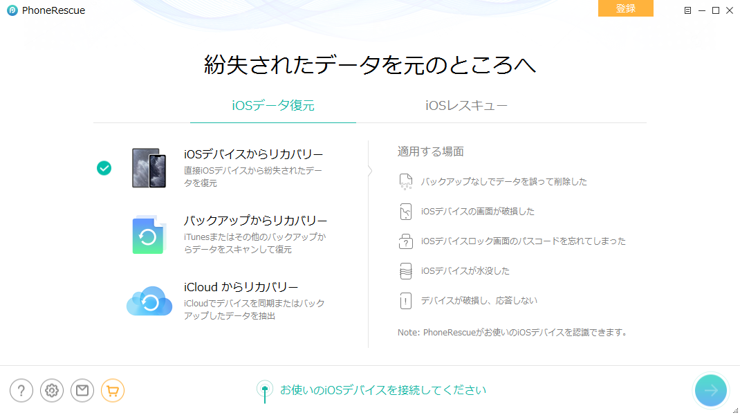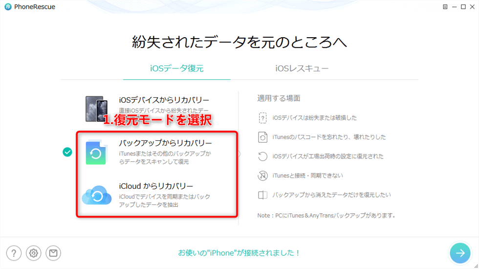 Step 1、パソコンにPhoneRescue for iOSを起動します > 「バックアップからリカバリー」または「iCloudからリカバリー」モードを選択します >ボタンをクリックします。