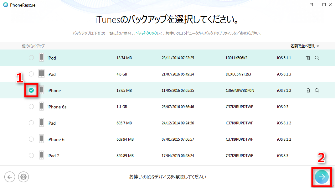 Step 1、PhoneRescue for iOSをインストール&起動 > iPhoneをUSBケーブルでパソコンに接続します。