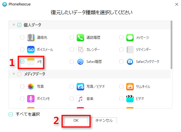 Step 3、「メモ」や復元したいデータを選択して「OK」をクリックしてください。