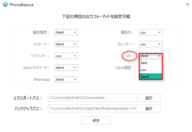 復元ボタンをクリックする前に、画面左下にある「設定」をクリックしてメモの出力フォーマットを設定することができます。