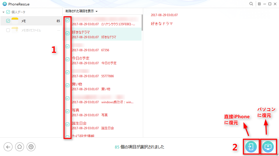 Step 4、上部にあるカテゴリーを「削除された項目を表示」に変更 > 復元したいメモをプレビュー・選択 > 右下の「パソコンへ復元」 アイコン、「デバイス本体へ復元」アイコンをクリックすると、メモがPCあるいはiPhoneに復元されます。