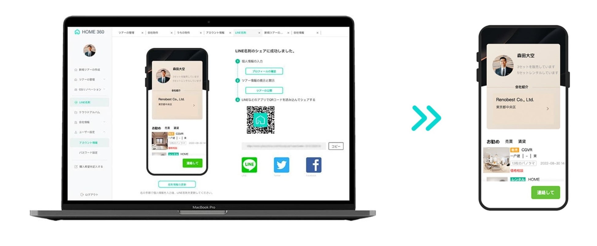 HOME360で作成したVRツアーは、URL・QRコードから閲覧したり、システムから各種SNSへの投稿が可能になります。また、現在開発中のLINEの企業専用ページをご利用頂くことで、取扱物件の一覧の表示や、おすすめ物件設定、お客様へのタイムリーなコミュニケーションが可能となります。