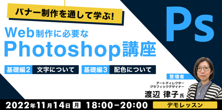 第1回「バナーづくりの基礎知識を学ぶ」に続き、今回は第2回「文字について」と第3回「配色について」を同日開催。バナーづくりの基礎を学びながら文字の選び方や大きさ、効果的な配色について理解を深める内容となっています。初心者の方はもちろんのこと、Web制作ツールの基礎力を高めたい方、バナー制作を学びたい方にもおすすめの内容です。