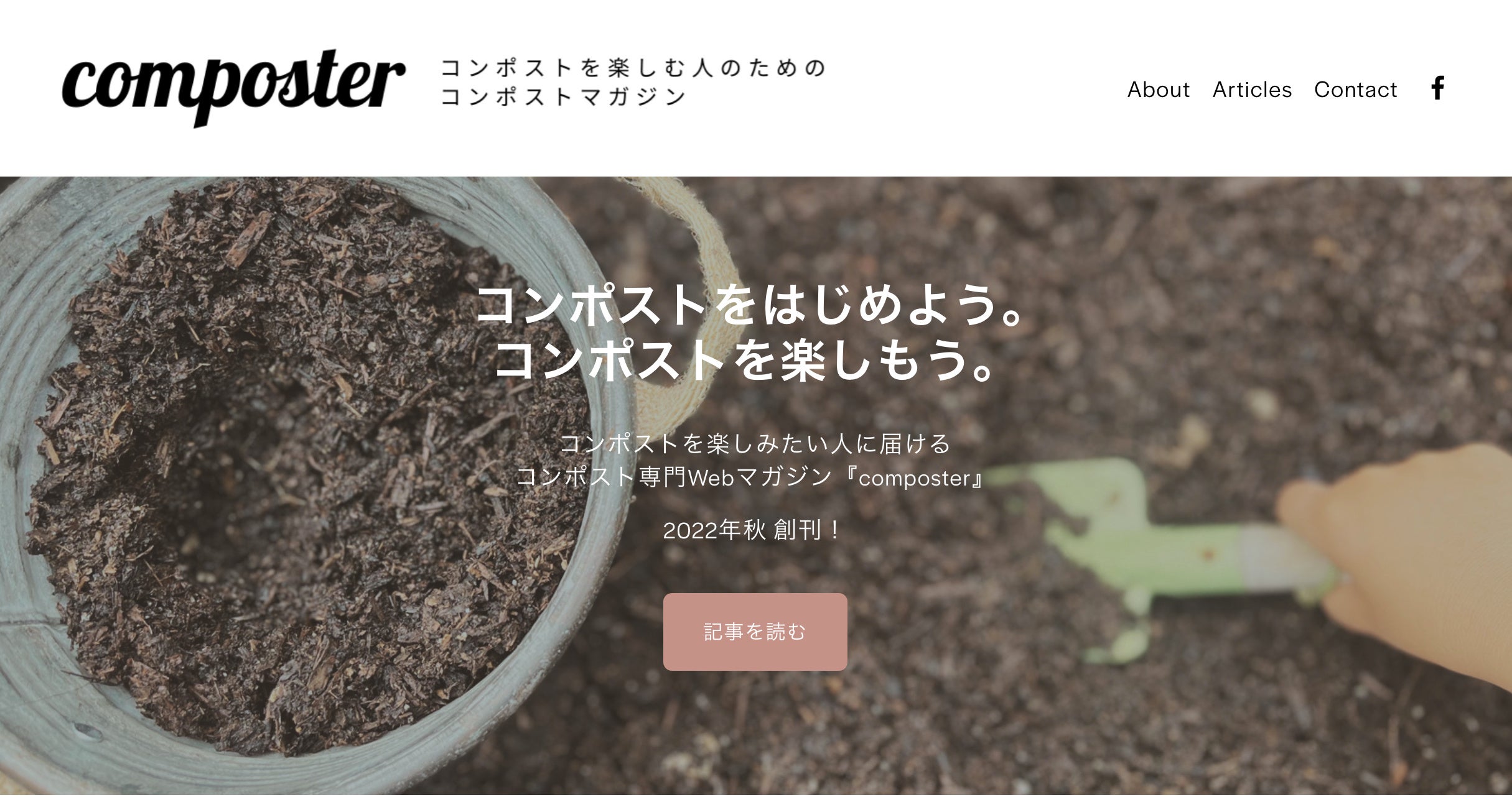 『composter』は「コンポストをはじめよう。コンポストを楽しもう。コンポスターになろう」をキャッチフレーズに、コンポストにまつわるあらゆる情報を発信するWebマガジンです。併せて、コンポストについての情報交換や相談の場としてオフィシャルFacebookグループを設置。情報収集の場としてのマガジン、コミュニティとしてのFacebookグループで構成いたします。