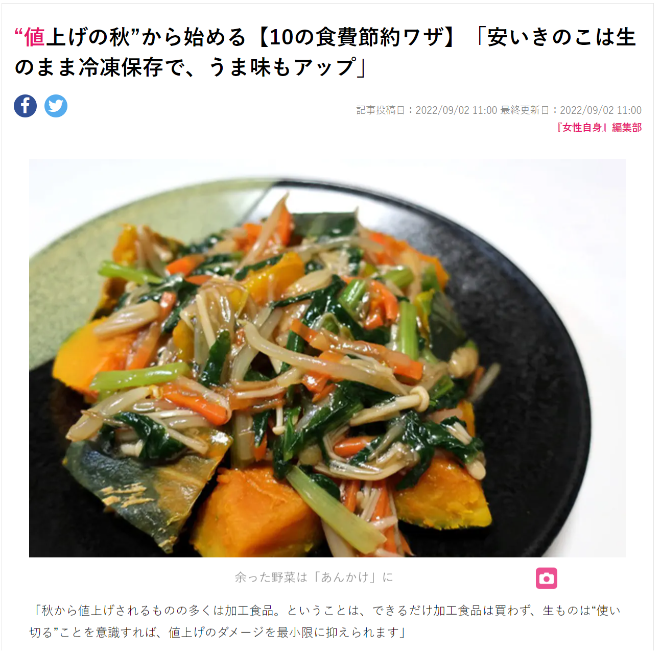 “値上げの秋”から始める【10の食費節約ワザ】「安いきのこは生のまま冷凍保存で、うま味もアップ」(女性自身 2022年9月2日)
