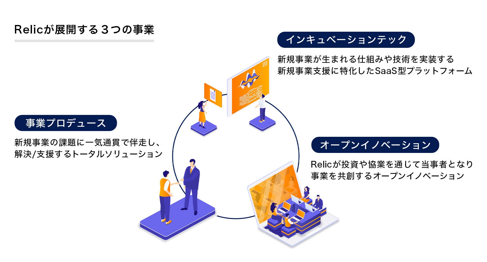 Relicは創業以来、新規事業創出支援に特化したSaaS事業である「インキュベーションテック」を活用したイノベーションマネジメントやオープンイノベーションの推進、クラウドファンディングを活用したファイナンスや事業性検証/マーケティング支援に加え、「事業プロデュース」を通じた新規事業創出プログラム・社内ベンチャー制度やアクセラレーションプログラム等の企画・運営や、事業構想・戦略立案からプロトタイピング、プロダクト開発やその後のグロースまで一気通貫で支援するトータルソリューションを提供してまいりました。