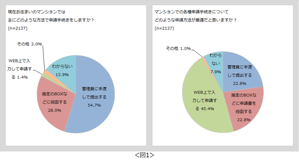 つなぐネットが運営する「マンション・ラボ」で2022年10月に実施した 「マンションの各種申請手続きに関するアンケート」※2によれば、回答者の約83%がマンションの各種届出場面で書面を利用していることがわかりました。一方で、指定用紙の入手や提出に手間を感じ、Web上での申請を希望する割合が約45%。コロナ禍における非接触志向もあり、マンション管理運用のデジタル化を求める声が高まっています(図1参照)。