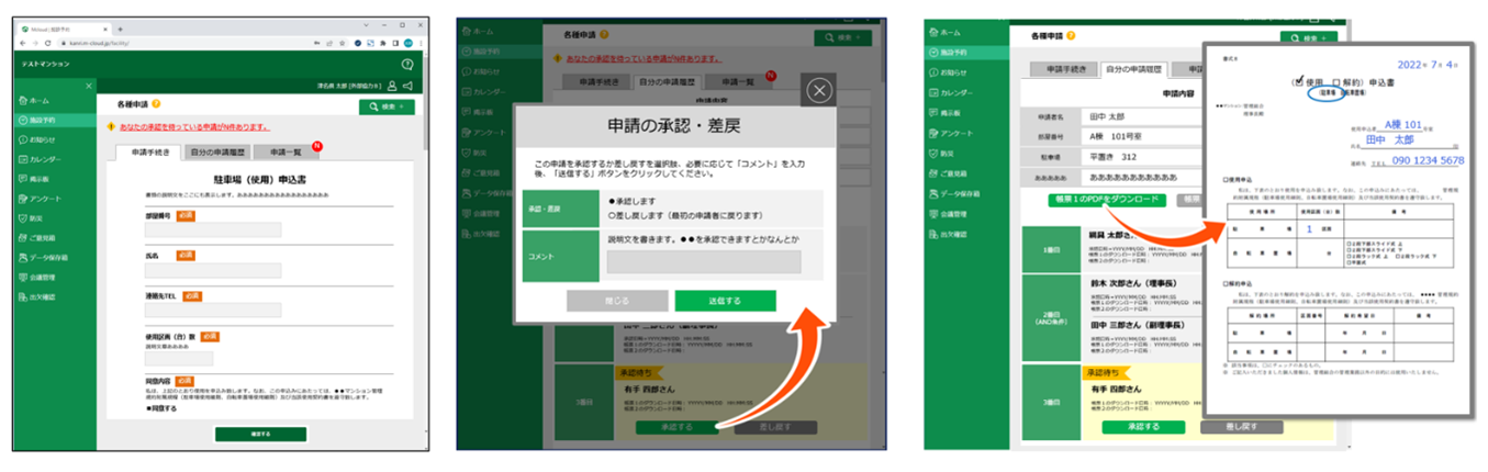 Mcloudの「各種申請」機能は、申請フォームの入力項目や承認フローを細かくカスタマイズできるため、マンション固有の「申請書式」にも柔軟に対応できるのが特徴です。現状の申請書式の雛形を元に、申請内容が自動印字されたPDFが生成できるため、書式の大幅な変更なく、アナログとデジタルの併用運用が可能になり、書面での保管はこれまで通り継続したいというマンションでも導入しやすい仕組みになっています。
